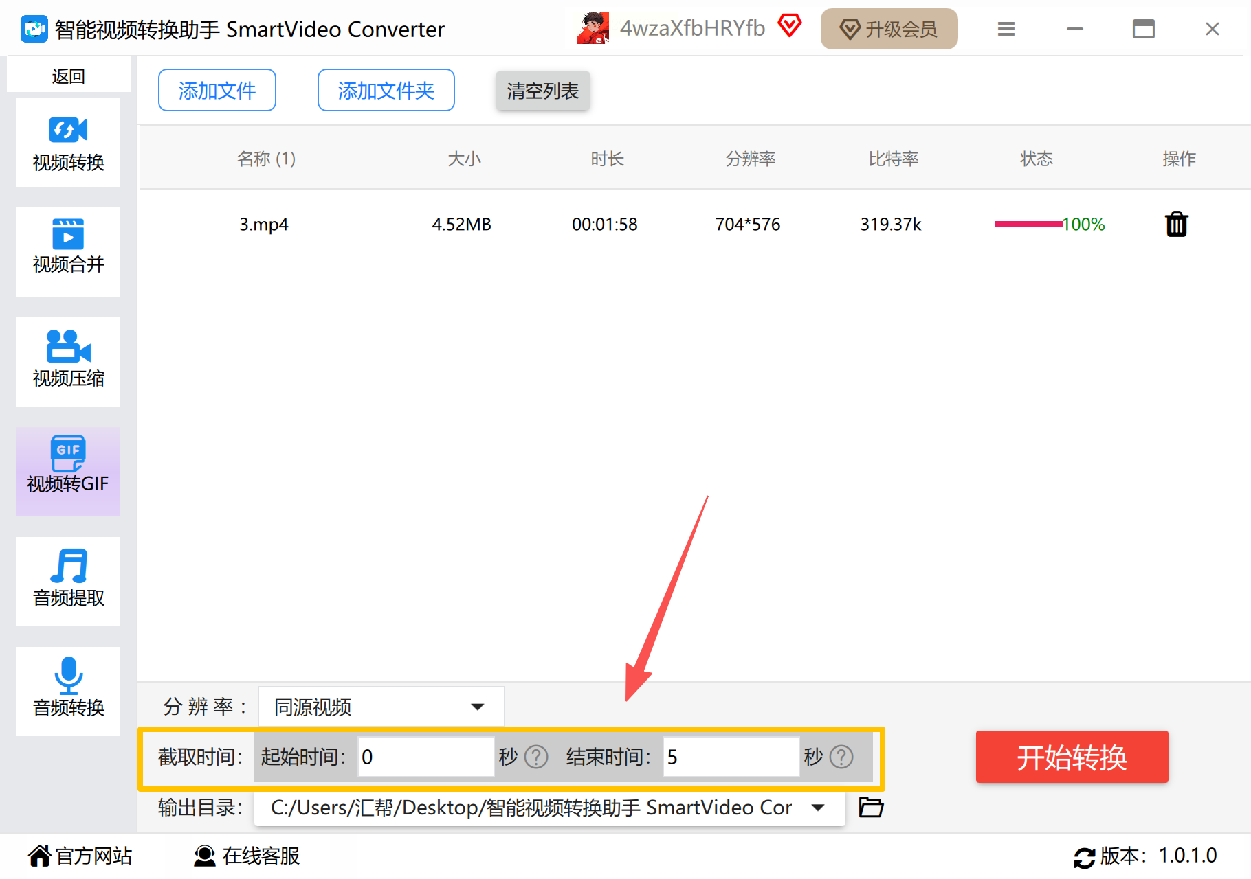 4. 截取时间,就是从什么时间段开始到什么时间段结束,这个可以打开视频看一下,记住自己需要的时间段