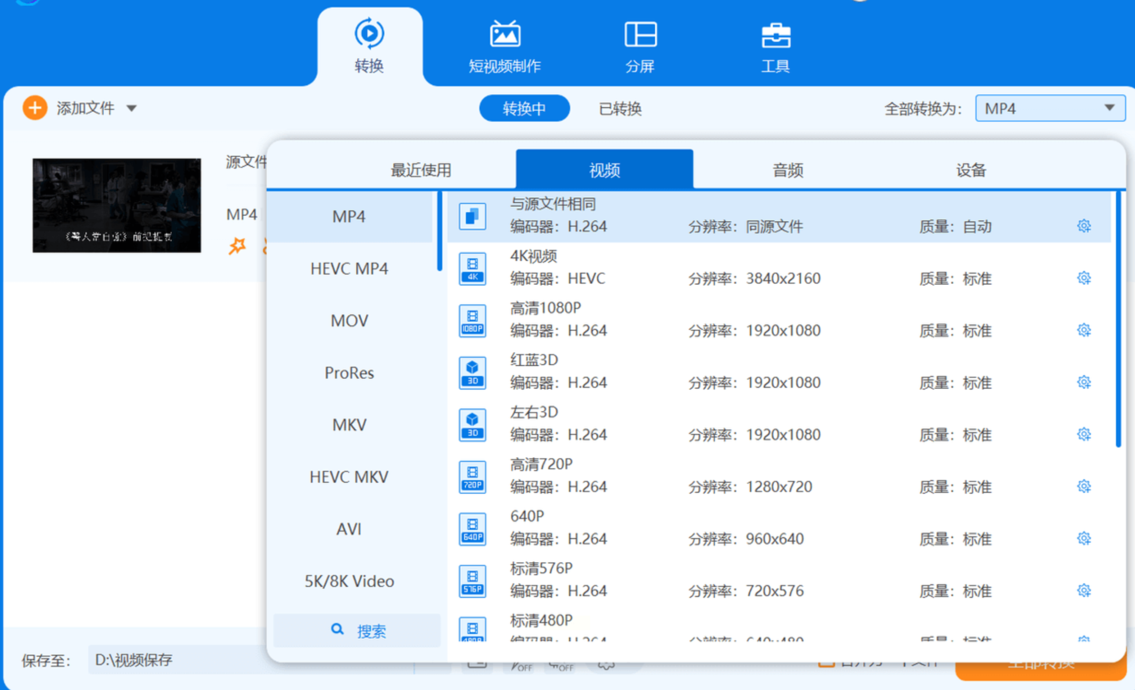 第二步:视频导入后,看界面左上角有个【全部转换为】的选项。点开它,会弹出一个格式大全。在“视频”那一栏里,找到MP4格式。这里有个贴心设计:你可以选择输出视频的质量,从流畅到超清都有。
