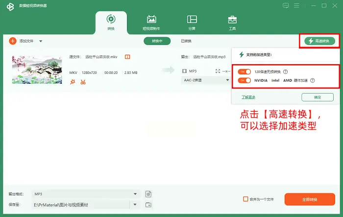 第二步:添加文件后,会看到【高速转换】选项。如果你的视频数量少于5个,其实不用开加速,区别不大。但如果一次性转换几十个视频,开启后能快不少。‘