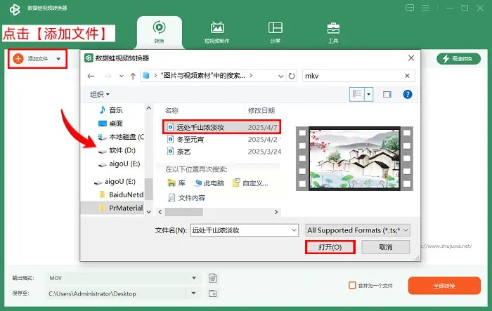 第一步:打开软件后点【添加文件】,如果你文件夹里视频很多很乱,有个技巧:在文件选择窗口的搜索框里直接输入“.3gp”,这样只会显示3GP格式的文件,特别方便!