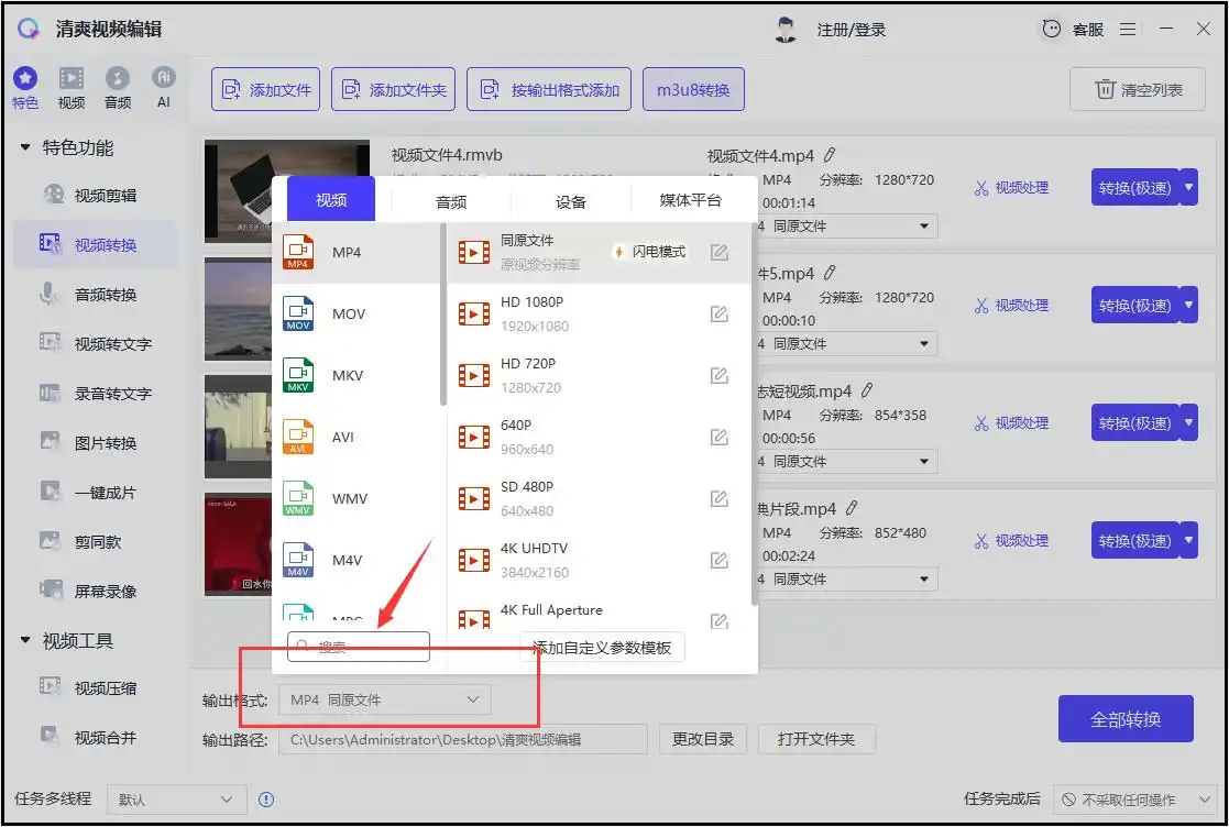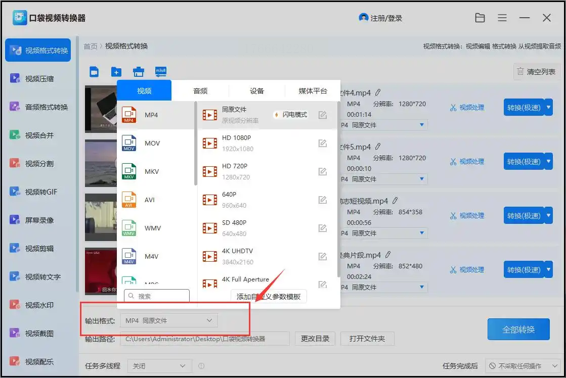 步骤三:文件添加后,在界面下方找到“输出格式”选项,点击下拉菜单,从中选择“MP4”格式。然后,直接点击右下角的“全部转换”按钮,软件就会自动开始工作。