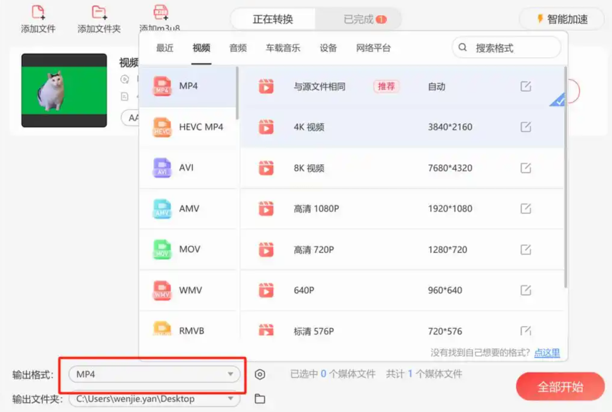 在输出设置区域,将格式明确选择为“MP4”。同时,你可以看到软件还支持AVI、MOV、MKV等几乎所有常见格式。
