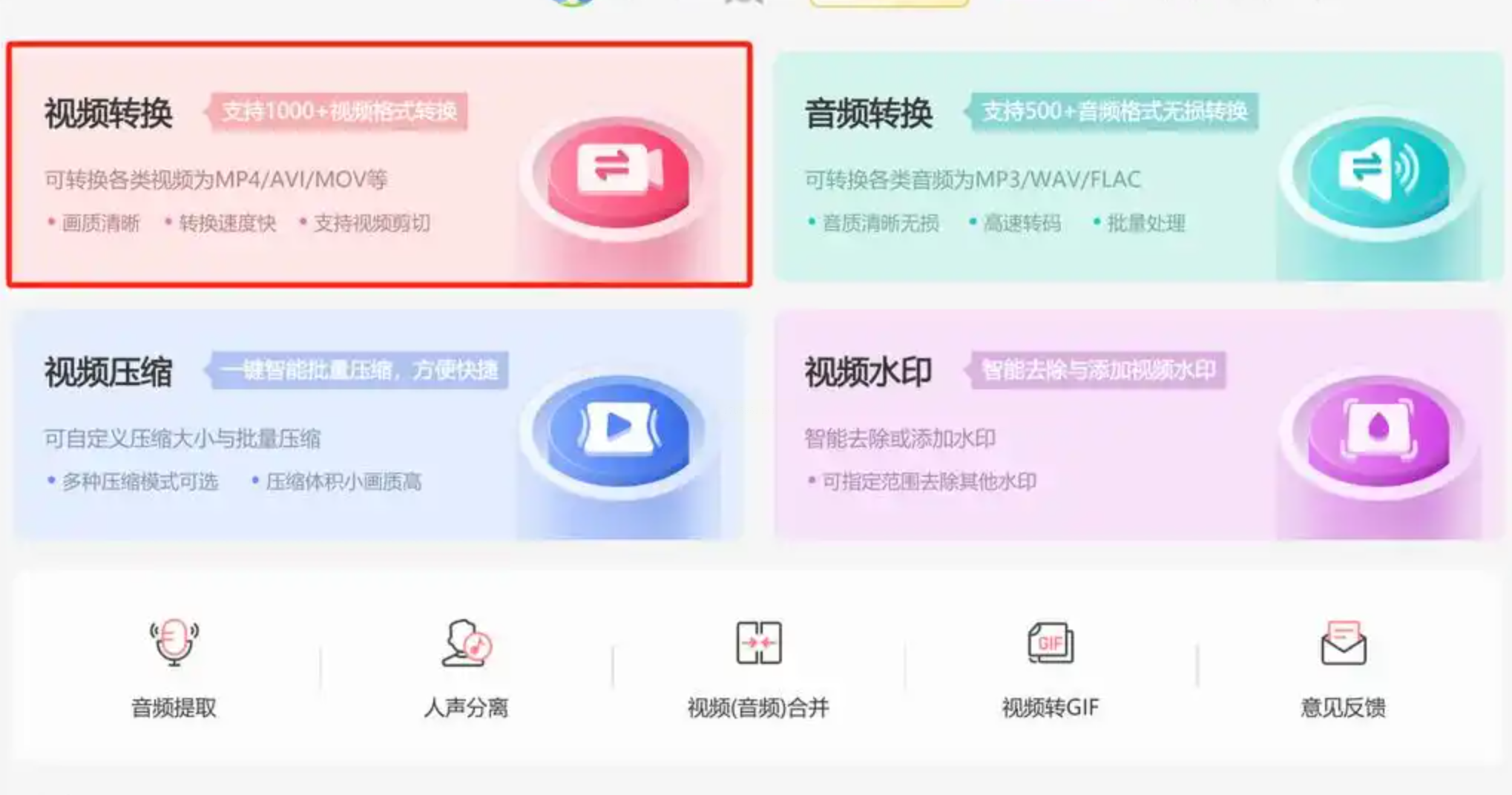 打开软件后,你会看到一个清晰的功能导航界面。我们直接选择“视频转换”核心功能,它通常支持数十种视频格式的互转。