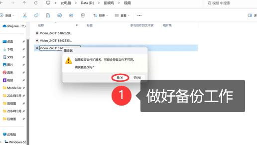 系统会弹出确认窗口,点"是"就行。这时候文件就"伪装"成MOV格式了,手机、电脑都能打开试试。不过要注意:这种方法只是改了个名字,视频实际内容没变,部分播放器可能不认,适合临时发朋友圈、测试用,别用来做正式文件!