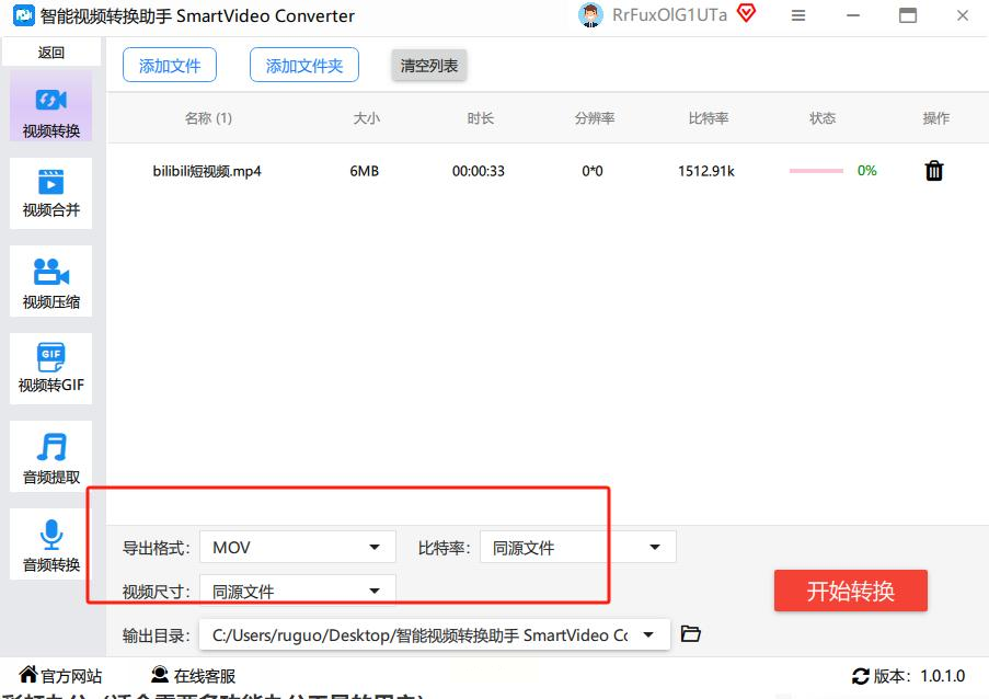 2. 选输出格式为"MOV",分辨率选默认的就行。