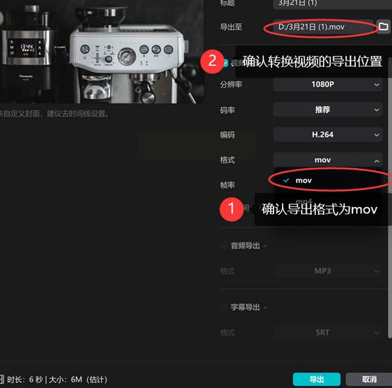 导出时别直接点"导出"!点格式设置,找到"MOV"格式(一般在"视频格式"里),分辨率选1080P就够用了。