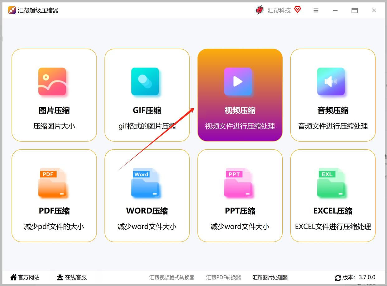 首次打开汇帮视频格式转换器,界面会跳出几个选项卡,找到“视频压缩”(别点错成格式转换啦!),点进去就能看到压缩界面。
