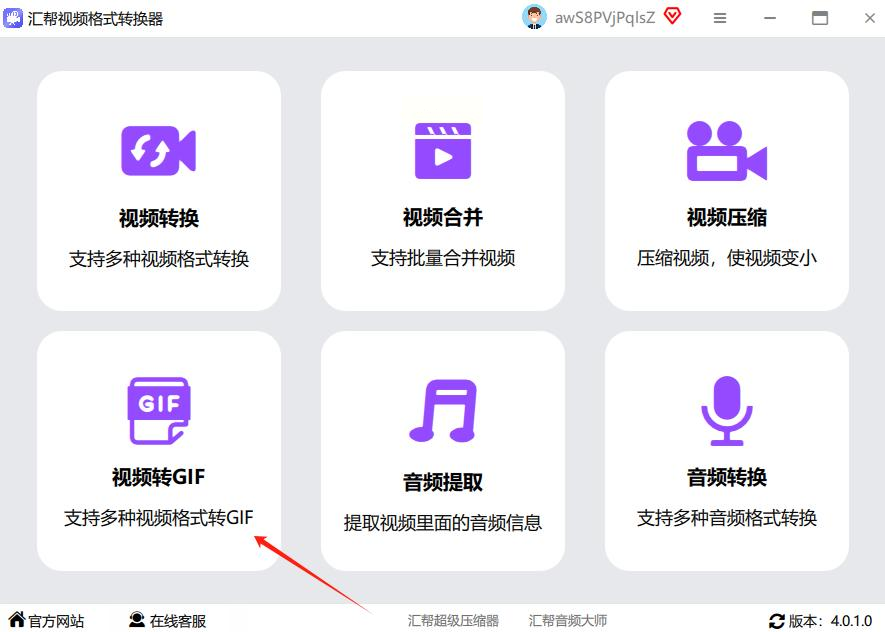 先在电脑上安装汇帮视频格式转换器(直接去官网下载,注意别点错广告),打开后界面很干净,找到「视频转GIF」这个按钮,点一下就好。