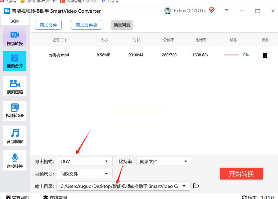 最后点“开始”按钮,软件就会自动处理转换。你能在状态栏看到进度,等进度到100%,就说明转换完成了,去指定的路径就能找到生成的OGV文件。