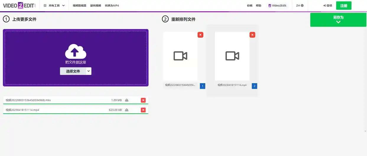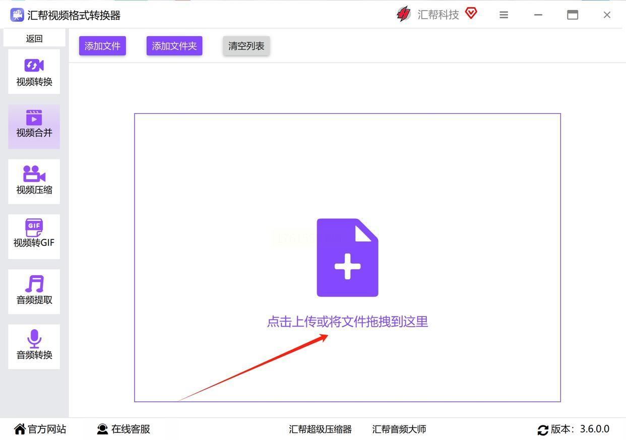 2. 添加视频文件:进入后,点击“添加视频”按钮(或者直接点击“+”号图标),从电脑里选择你要合并的所有视频文件,一次可以添加多个,软件会自动开始上传和加载,这个过程可能需要一点时间,取决于视频大小和网络速度,加载完后你能在界面上看到视频的缩略图列表。