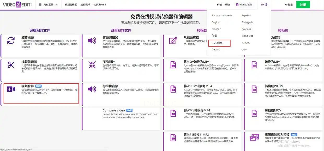 1. 进入在线工具网站:在浏览器里搜索“视频合并工具”,找到一个口碑好的在线平台(尽量选加载快、界面干净的),进入首页后,你会看到语言设置,先切换成中文(如果不是中文的话),然后找到“视频合并”功能按钮,点击进入。