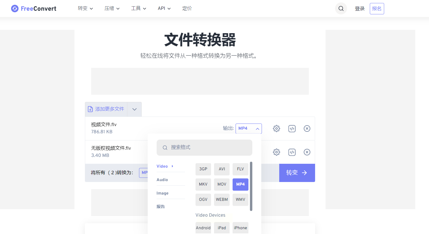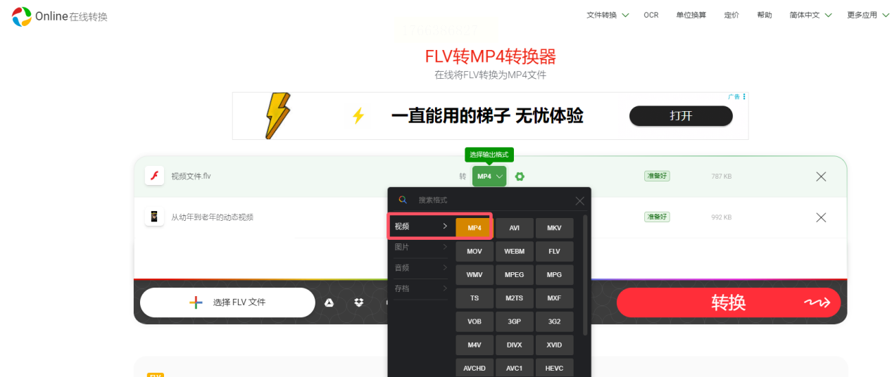 另一个在线转换的选择。打开它的网站,界面支持中文。点击上传你的FLV文件,注意免费版有文件大小限制(比如不超过3MB)。上传后,在输出格式设置中选择“MP4”。然后点击“转换”按钮。转换结束后,你可以下载转换后的文件。免费用户可能需要等待排队,页面也可能有广告。