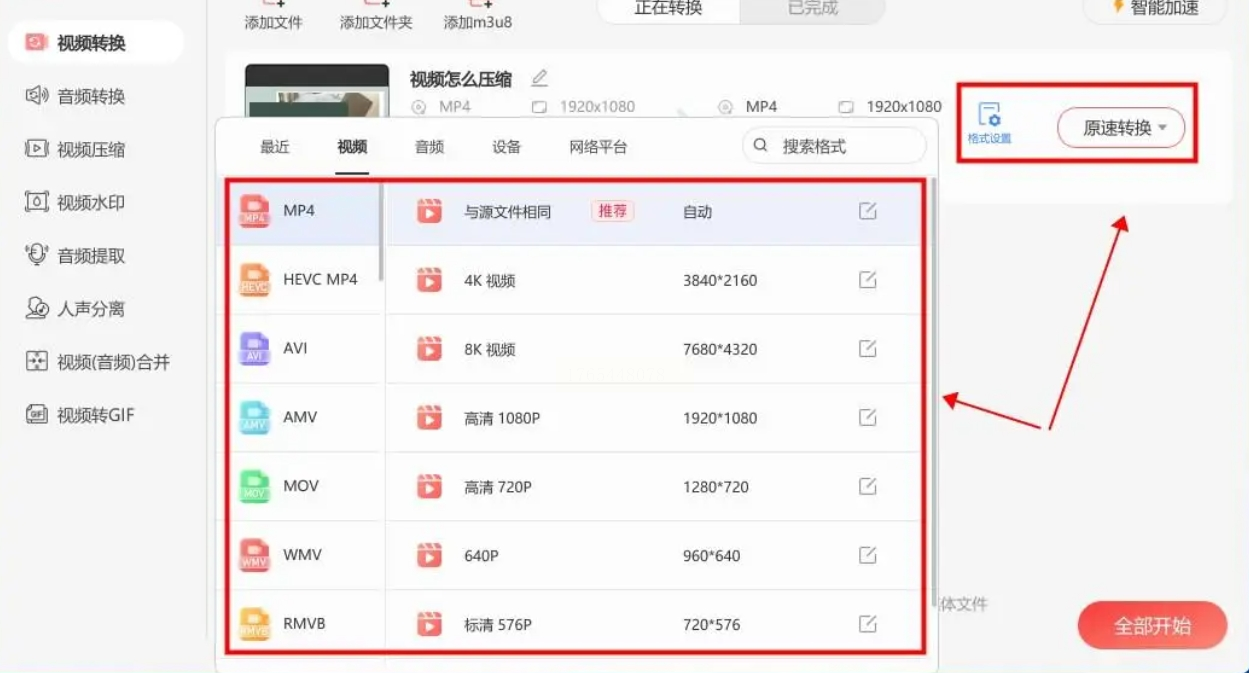 4. 调整参数(可选):在格式旁边,你还可以看到“分辨率”和“比特率”的选项。如果你不太了解这些参数,保持“同源文件”或“默认”是最好的选择,这样可以保证转换后的画质和原来差不多。