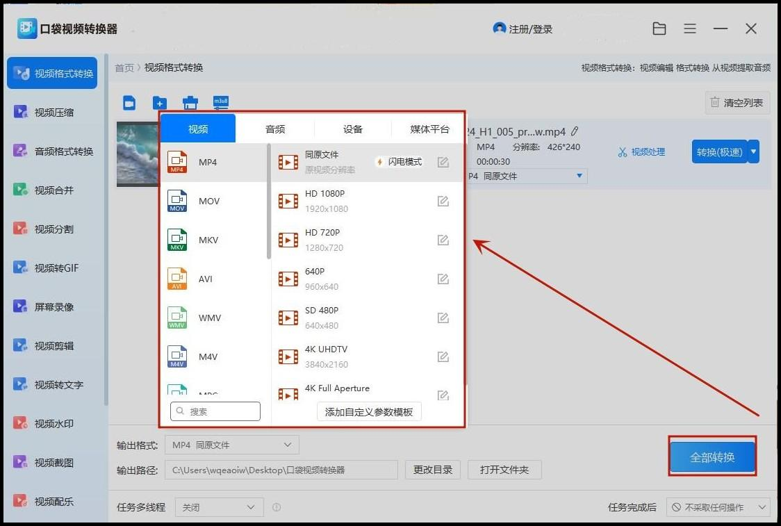 步骤三:在输出设置中选择MP4格式,可调整编码参数