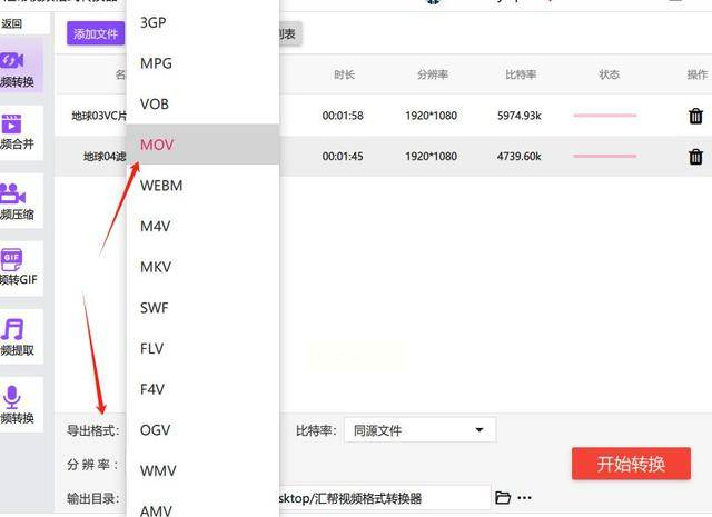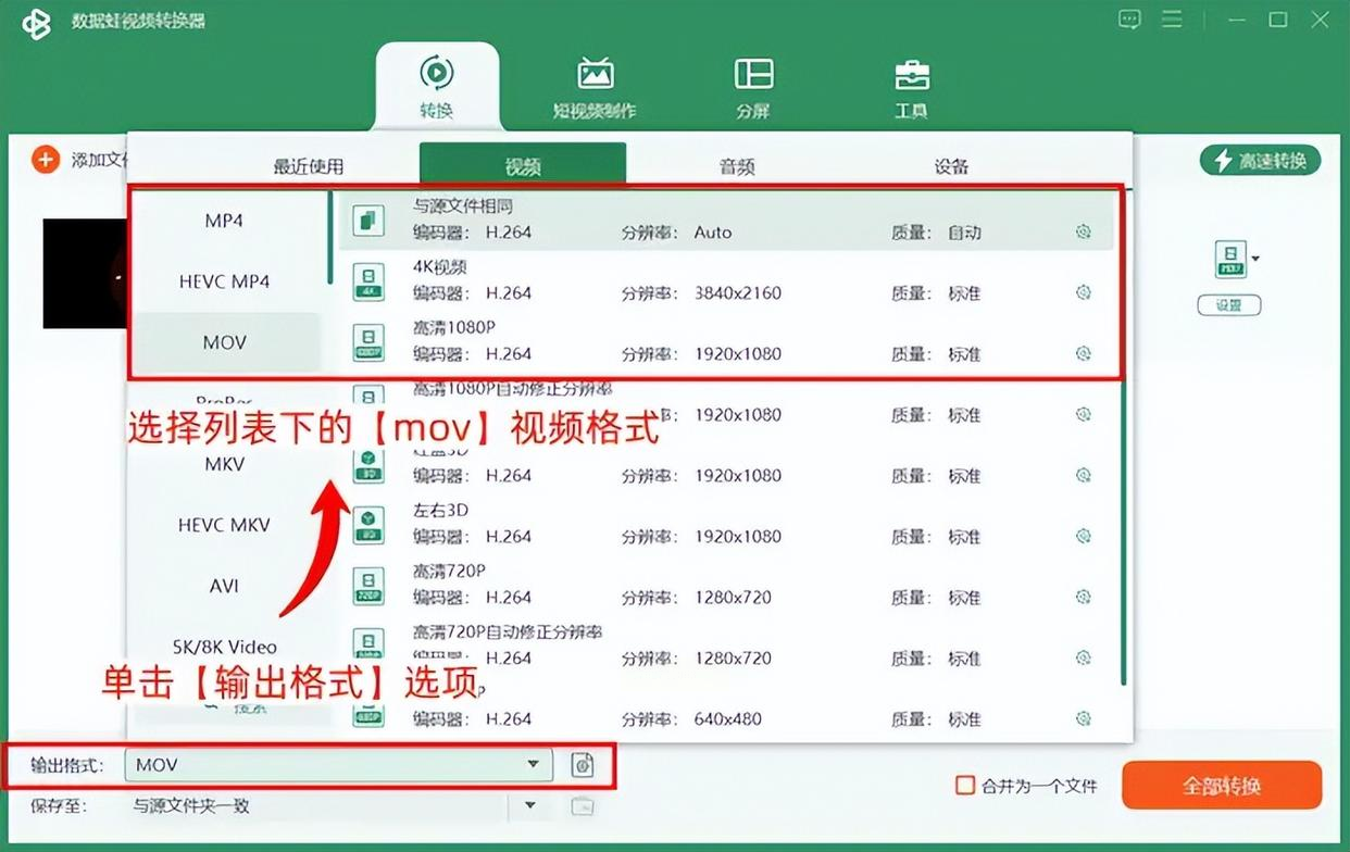4. 设置输出格式:在“输出格式”下拉菜单中选择“MOV”格式,分辨率可根据需求选择“同原文件”或自定义参数(如720P、1080P)。