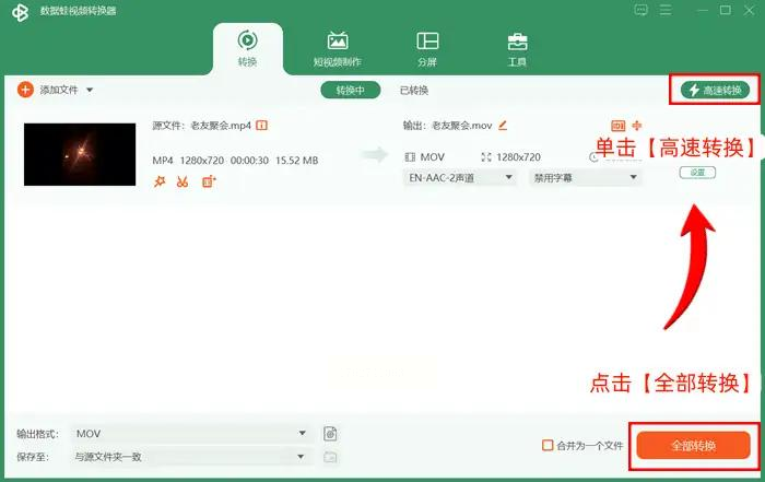 3. 开始转换:设置好格式和参数后,点击右下角的“全部转换”按钮,软件会立即开始处理视频。转换进度条会实时显示,完成后会有弹窗提示。