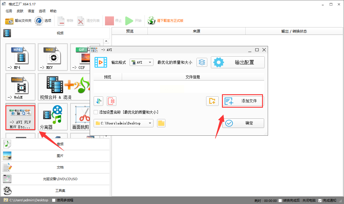 打开格式工厂后,在左侧功能区找到"视频"分类下的"AVI/FLV/MOV"选项,点击进入。