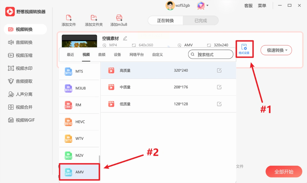 2. 在格式选项中选择AMV,自定义编码参数(分辨率、比特率等)。