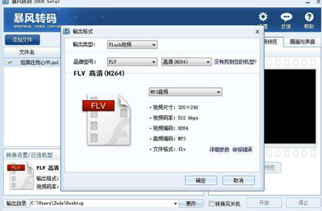 3. 可自定义调整分辨率、比特率等参数,最后选择输出目录,点击“确定”开始转换。