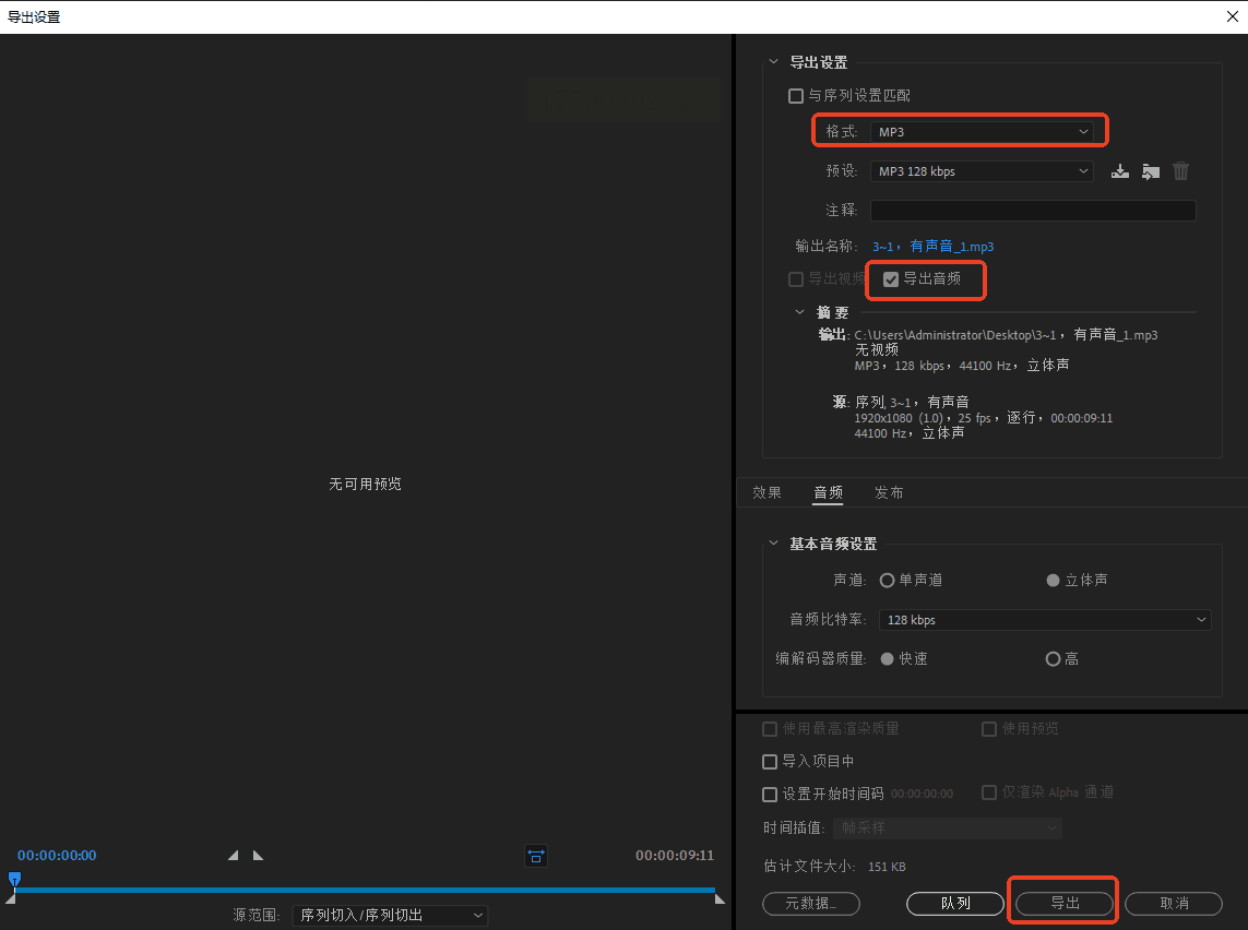 接着按Ctrl+M(Windows)或Cmd+M(Mac)打开导出设置,在“格式”中选择“MP3”,并确保勾选“导出音频”选项。用户可进一步调整采样率或声道数,最后点击“导出”生成文件。