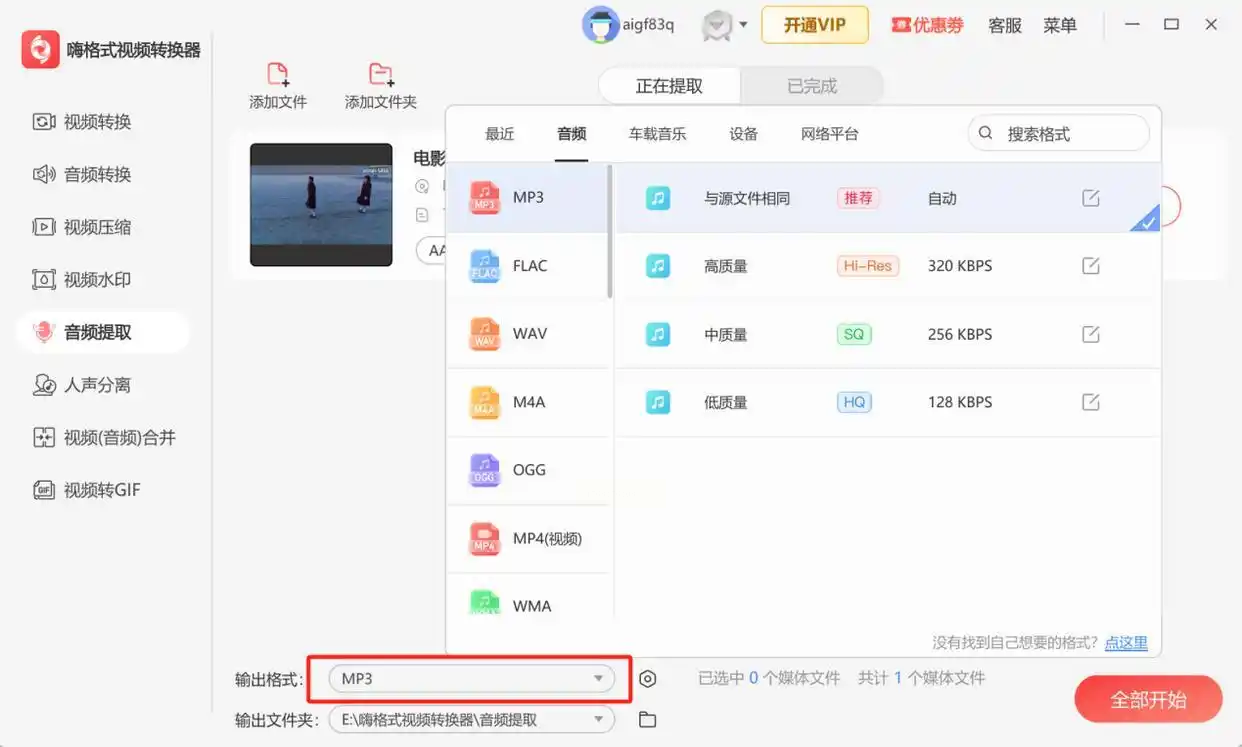 在输出设置中,将格式选择为通用的MP3,或者根据你对音质的要求选择FLAC、WAV等。MP3在文件大小和音质上取得了很好的平衡,适合绝大多数场景。