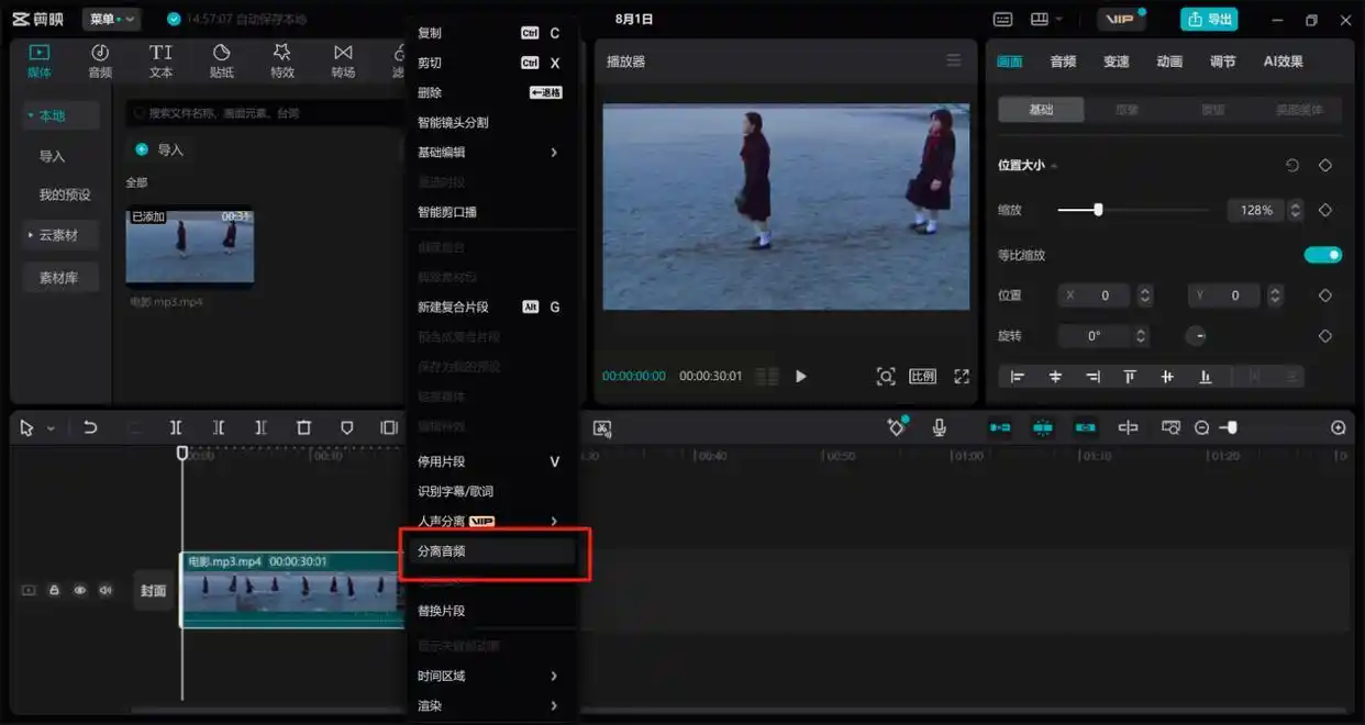右键点击时间轴上的视频片段,在弹出的菜单中选择“分离音频”功能。瞬间,原来的视频轨道就会拆分成独立的视频轨道和音频轨道。