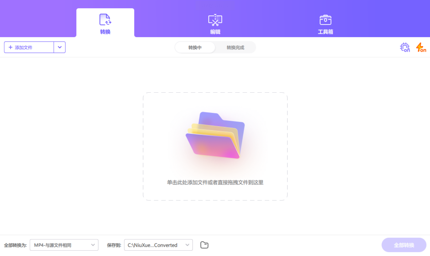 在电脑上安装并打开“牛学长转码大师”软件。进入主界面后,它通常默认就在“视频转换”或类似功能下。最直接的方法就是:打开你存放OGV视频的文件夹,直接用鼠标把文件拖拽到软件的界面窗口中。