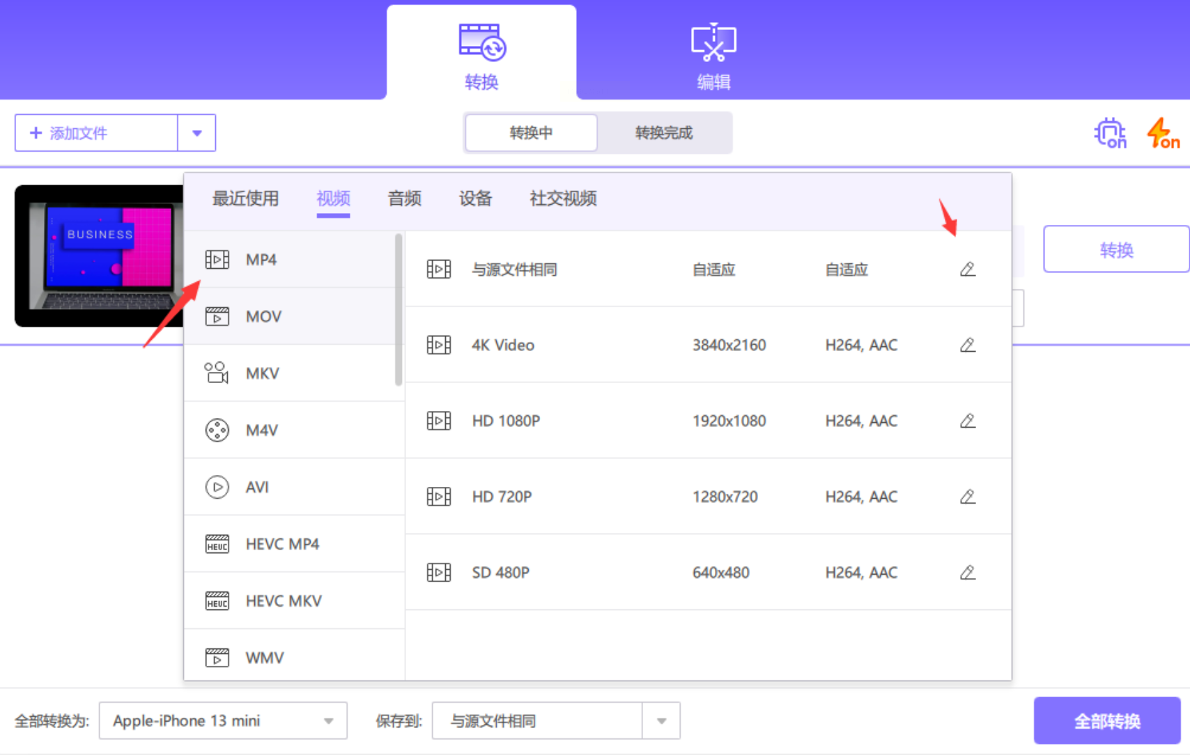 文件添加后,在软件界面中找到输出格式的设置区域。将输出格式设置为“MP4”。如果你对视频的码率、帧率等有特别要求,可以找到视频文件旁边的一个“编辑”图标(可能是个小齿轮或铅笔图案),点击进去进行自定义设置。如果只是普通转换,用默认参数即可。