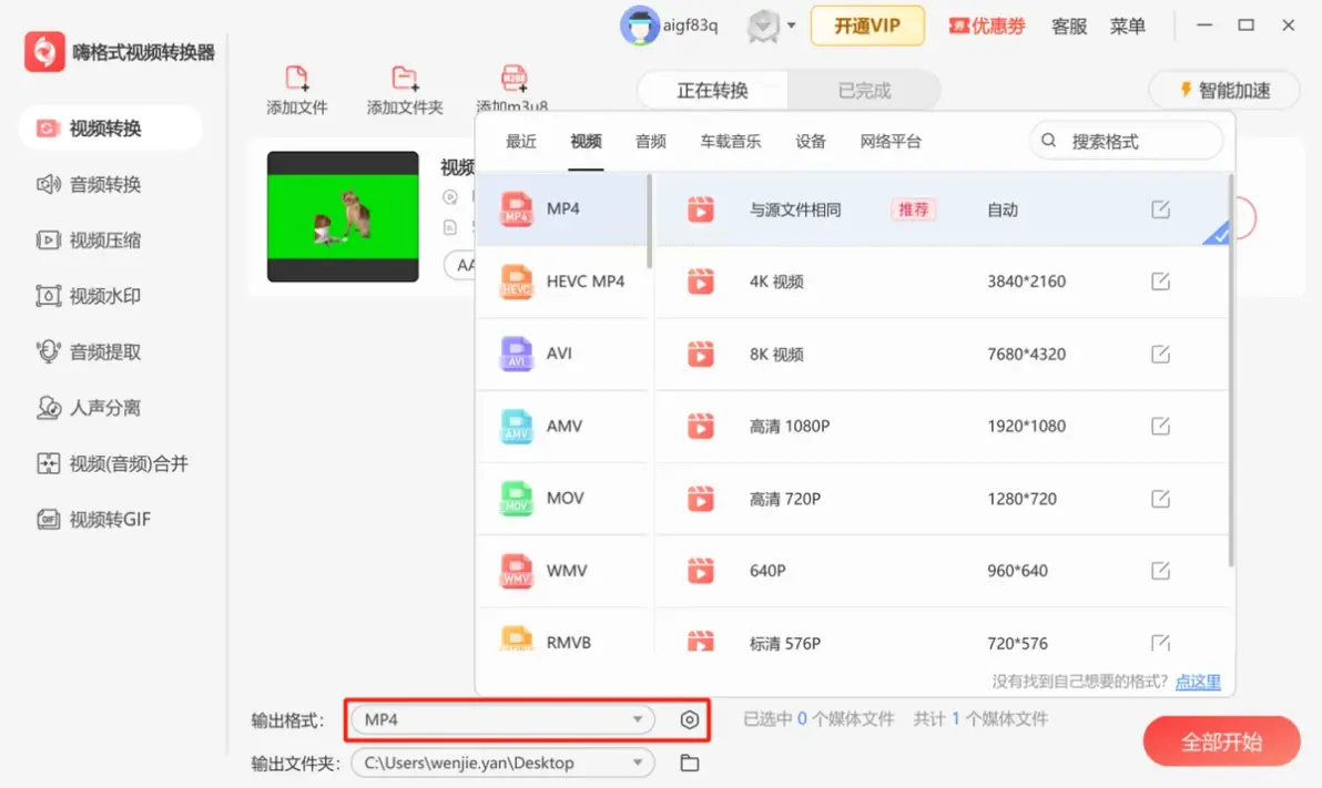 - 在输出格式中选择"MP4"(默认H.264编码)