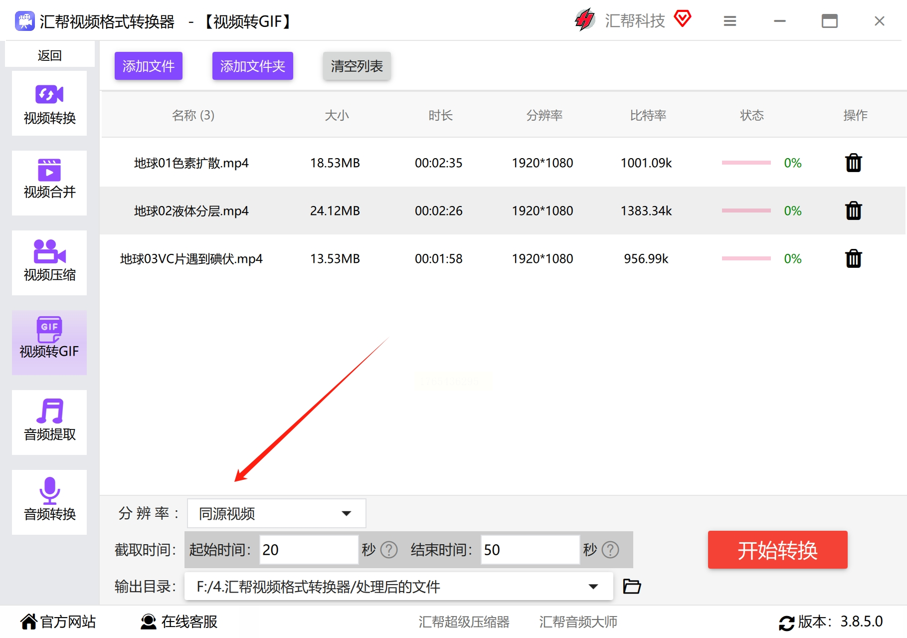 1. 安装与启动:在下载安装汇帮视频格式转换器,打开软件后点击左侧“视频转GIF”模块。