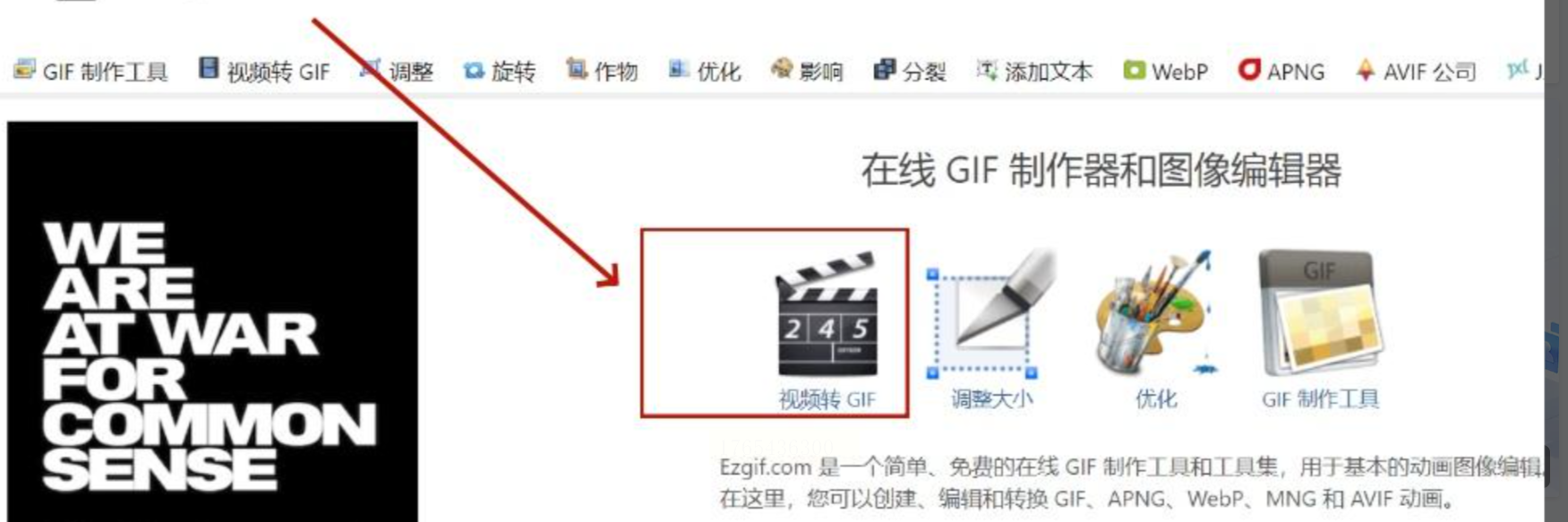 1. 打开页面:搜索引擎搜索“ezgif”,进入官网后点击“视频转GIF”。