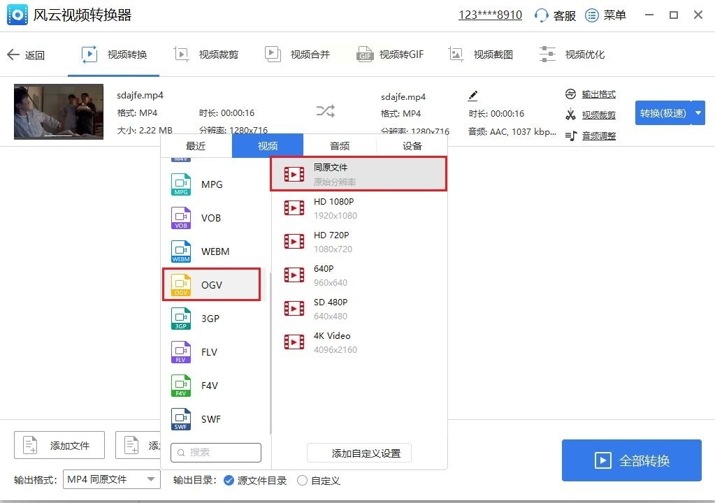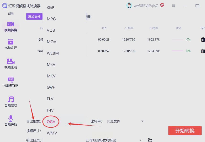 3. 选择输出格式:在格式列表里找到“OGV”,点击选中。有的APP可以同时转换多个文件,勾选多个MP4就行。