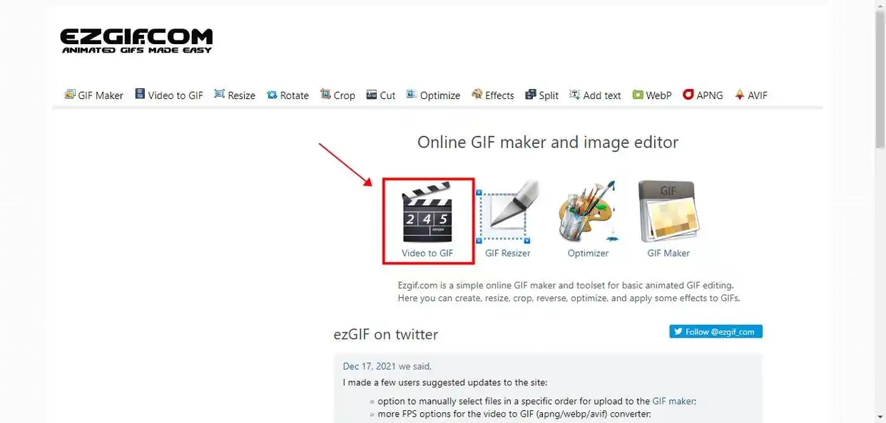 2. 选择功能:在首页找到“Video to GIF”选项,点击进入转换界面,不用安装软件就能做mp4做成gif。