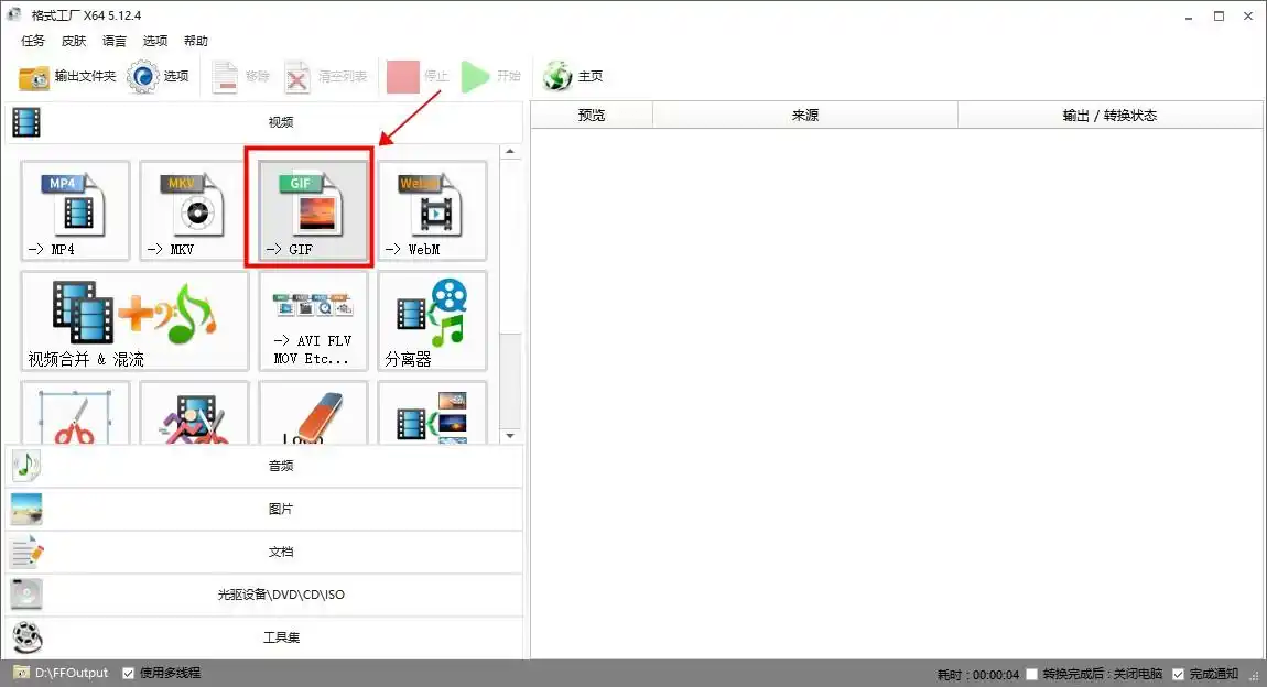 1. 选择功能:打开格式工厂,在主界面的“视频”分类中找到“→GIF”选项并点击。