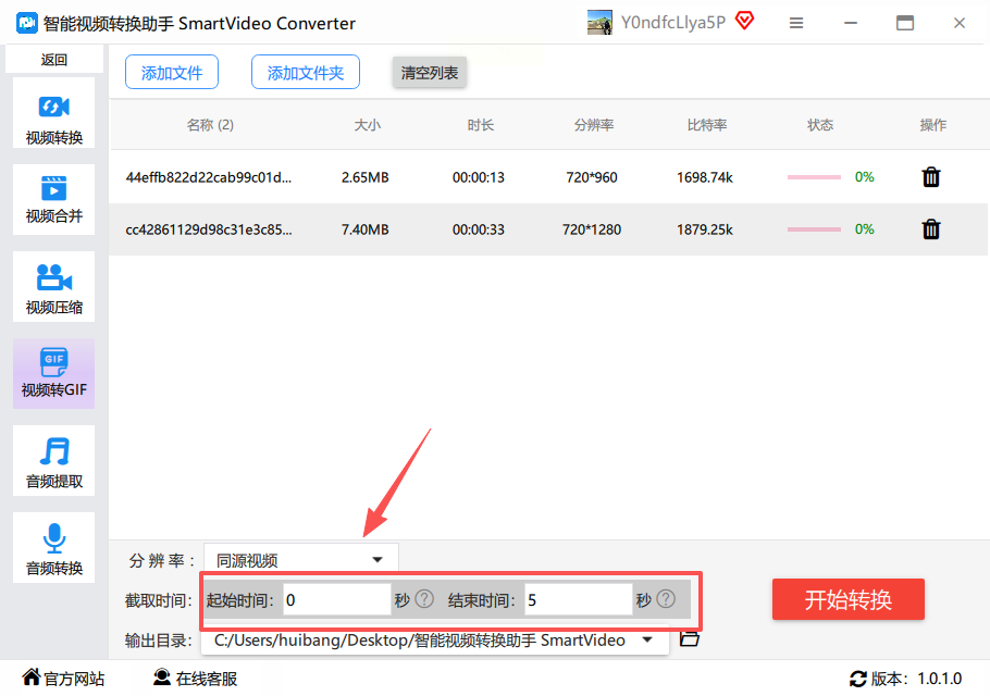 3. 设置参数:视频导入后,下方会显示分辨率和时间轴。分辨率越高,GIF画质越清晰;时间轴可以拖动滑块选择需要转换的片段,建议截取最精彩的几秒。