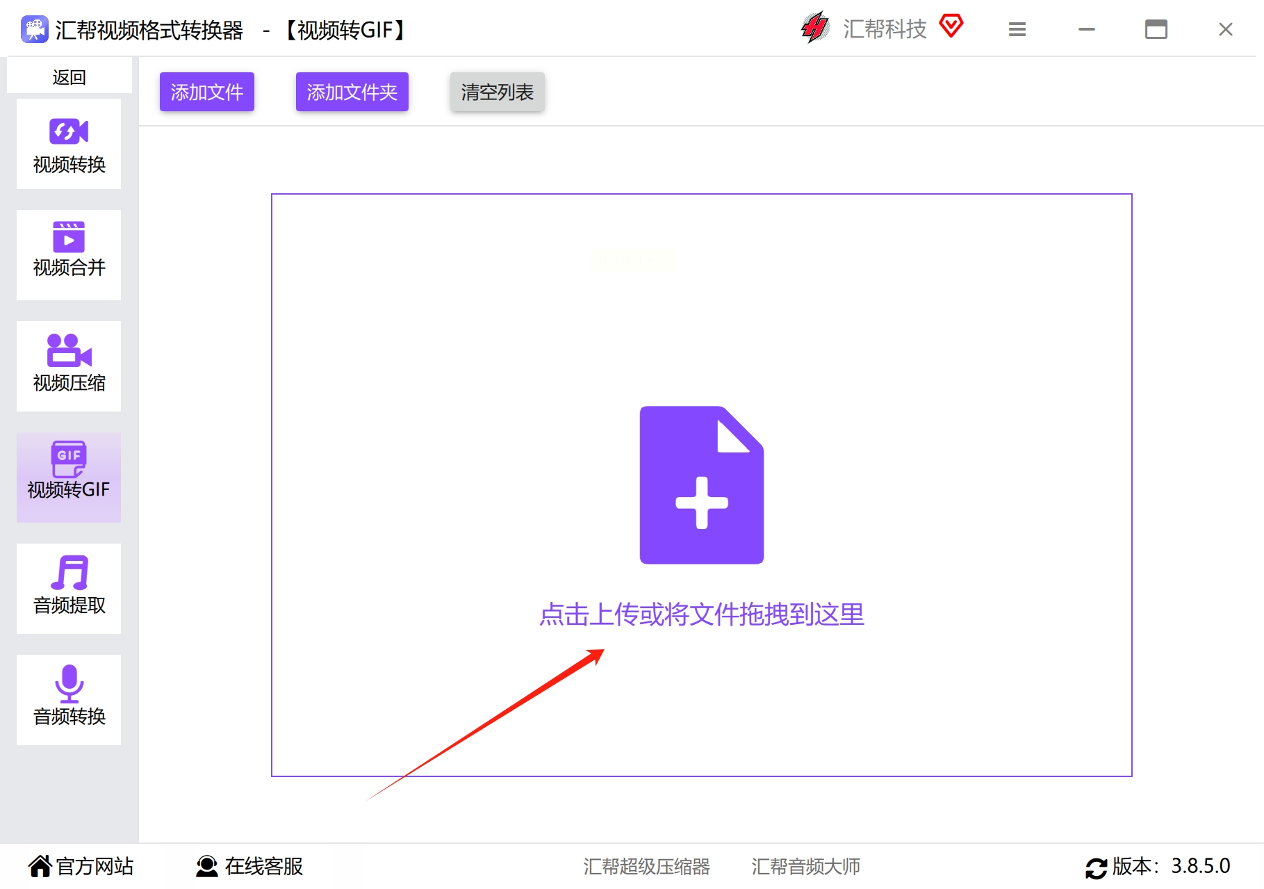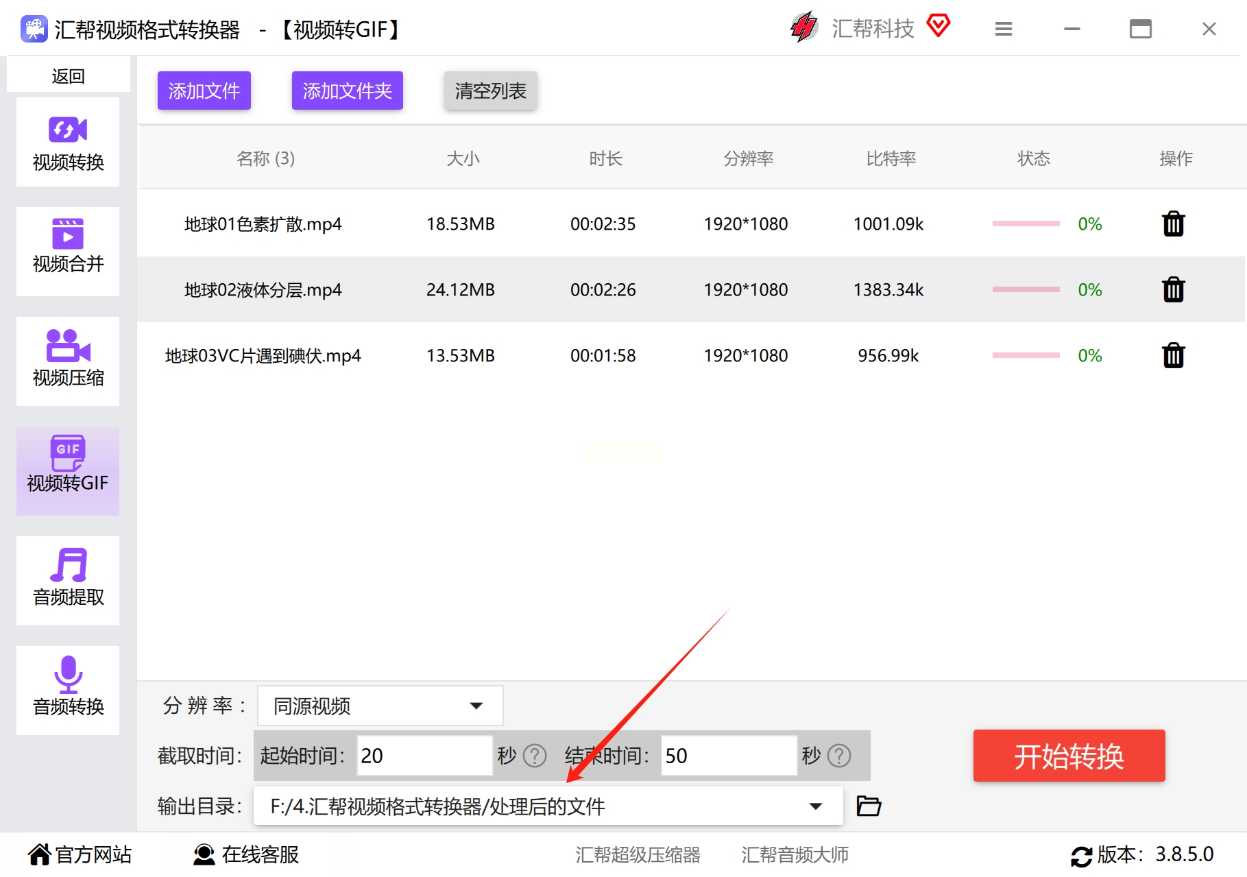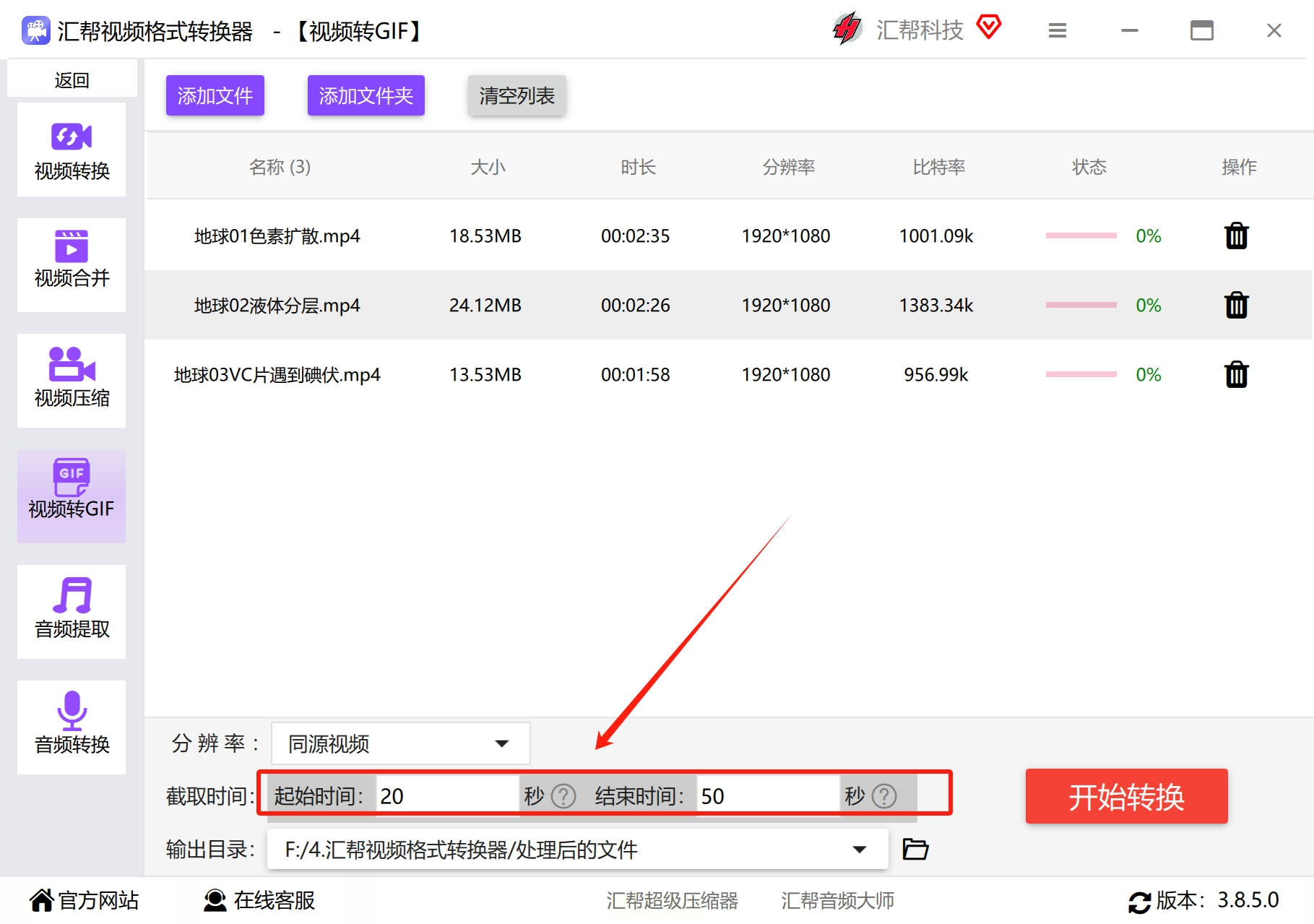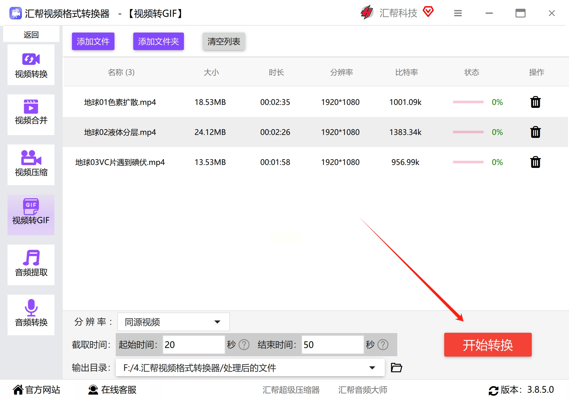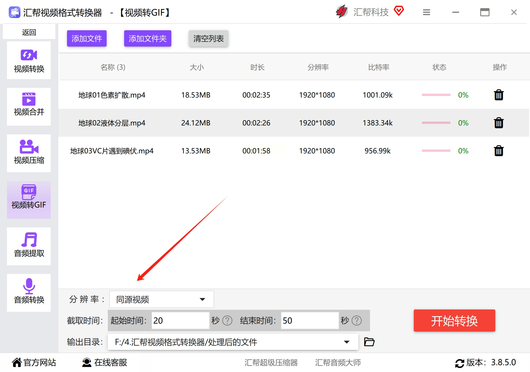 在你电脑上安装好“汇帮视频格式转换器”后,打开它。软件界面很清爽,功能一目了然。我们直接找到并点击那个 “视频转GIF” 的选项,进入核心操作区。