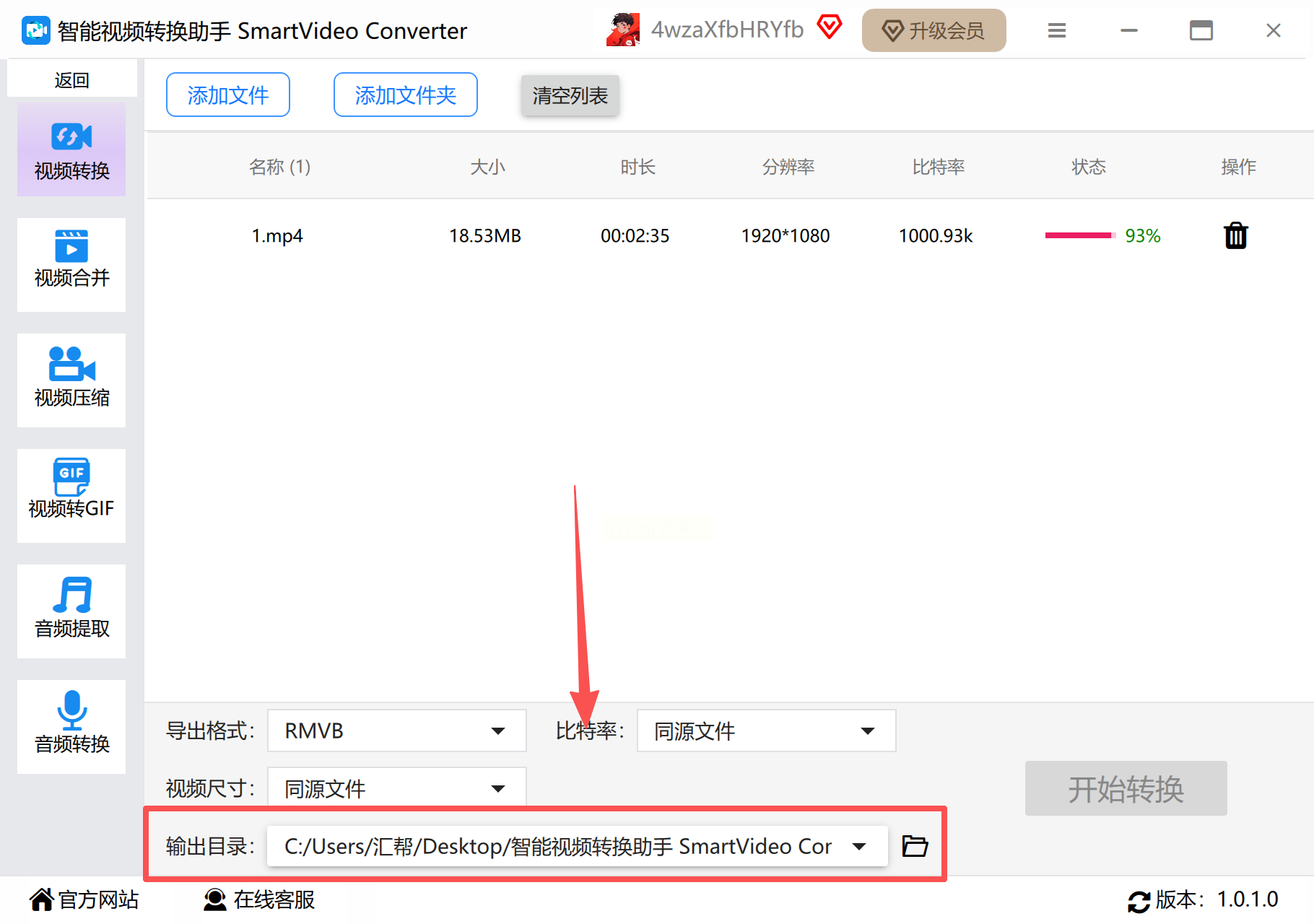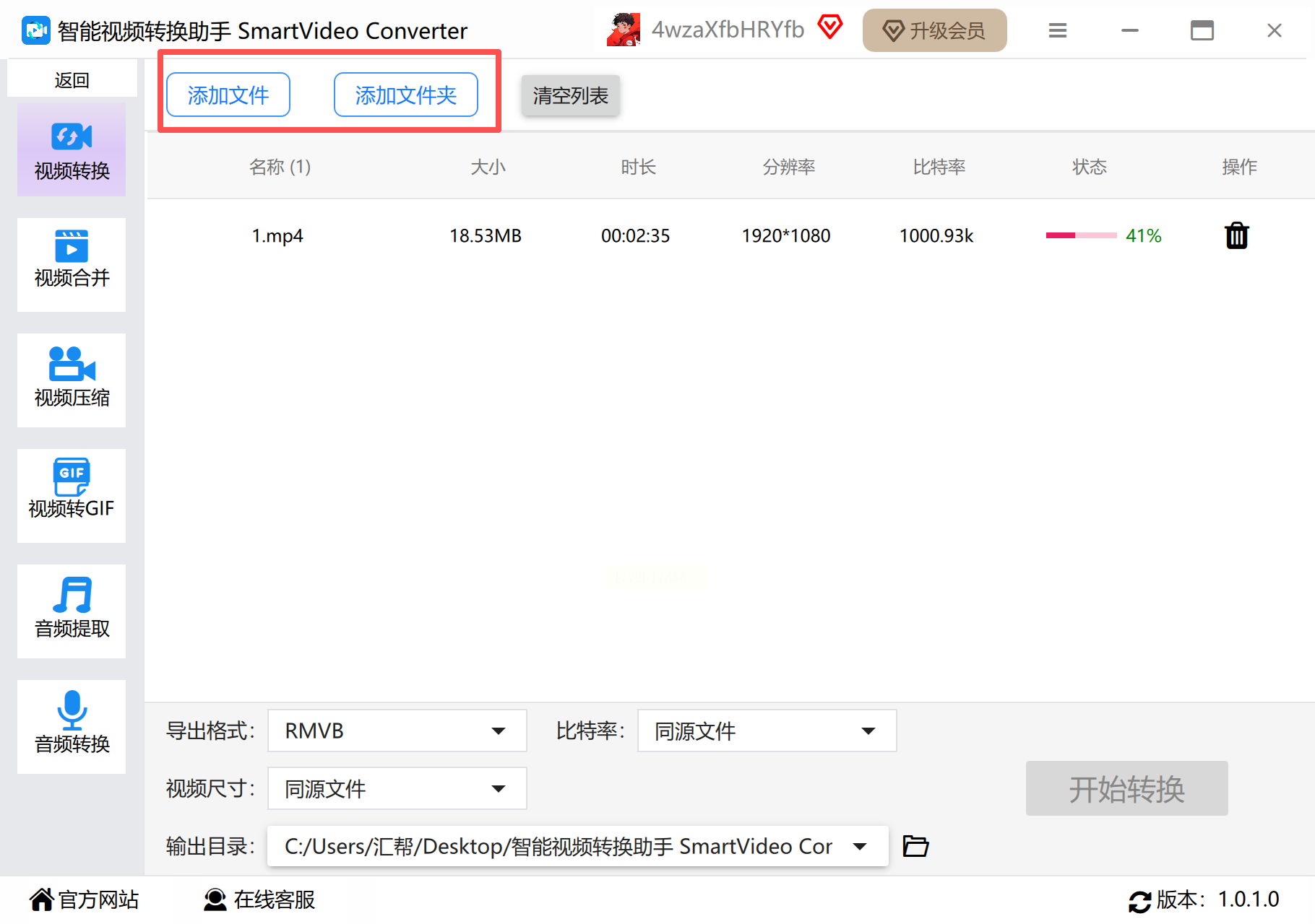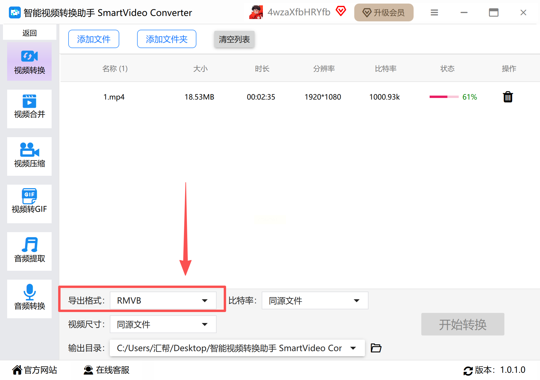 2. 选择输出格式:在格式列表中找到"RMVB"选项,点击选中。平台会自动分析文件信息,推荐合适的参数设置。
