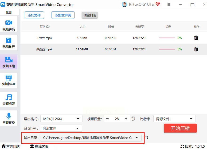 5. 点击“开始压缩”,软件会显示每个视频的压缩进度。