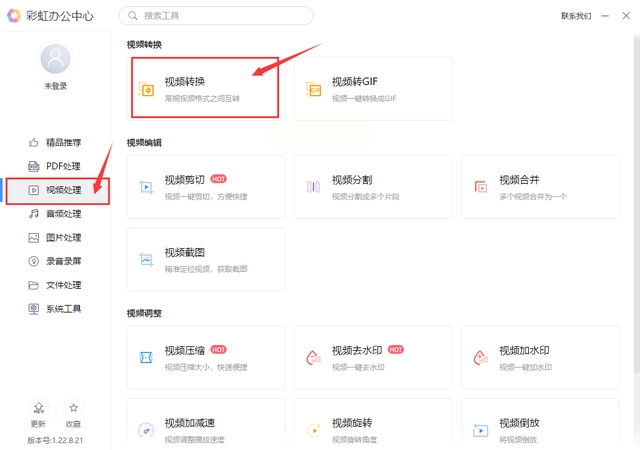 步骤一:在电脑上安装并打开彩虹办公中心。在软件左侧的功能分类中,找到“视频处理”或类似大类,然后点击其中的“视频转换”功能。
