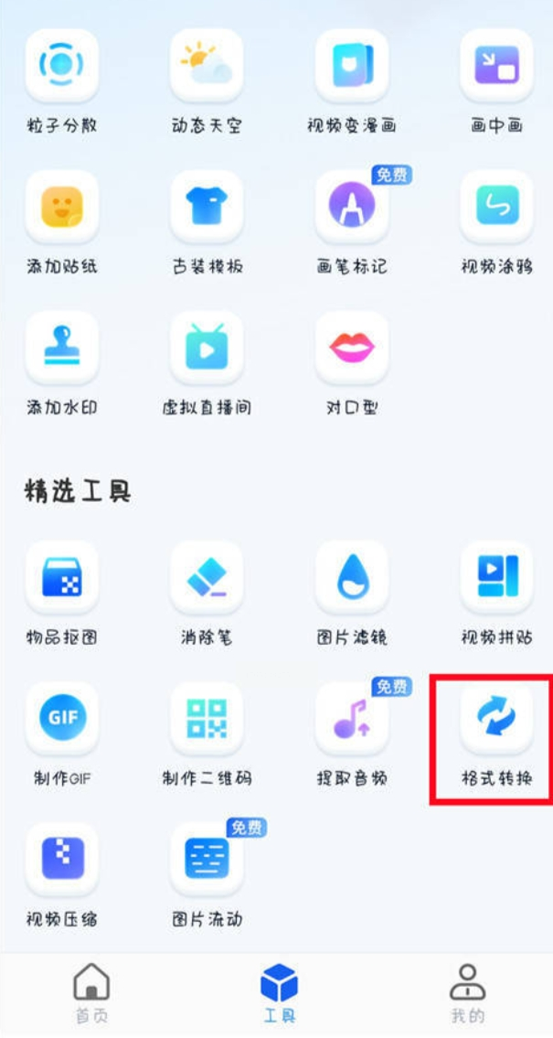 打开手机里的“书单视频助手”,在首页最下面有个“工具”按钮,点进去就能看到各种视频处理功能。找到“格式转换”这一项,点进去就可以了。