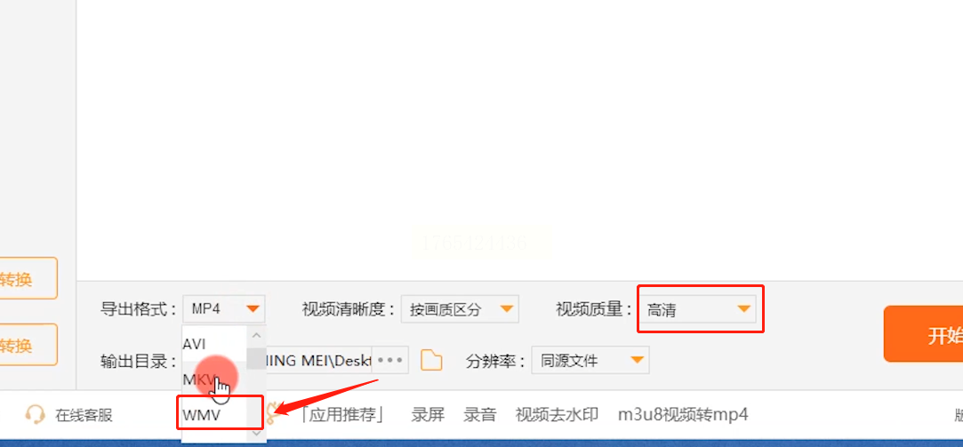 步骤三:在输出设置区域,将“输出格式”下拉菜单选择为“WMV”。