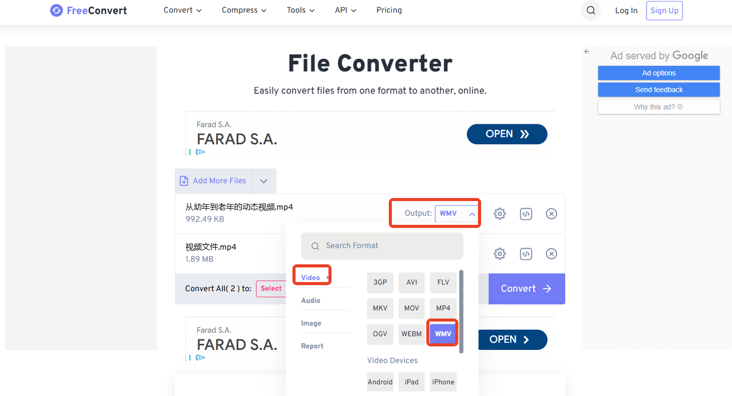 步骤三:文件上传后,在“Output Format”(输出格式)的下拉菜单中,滚动找到并选择“WMV”。