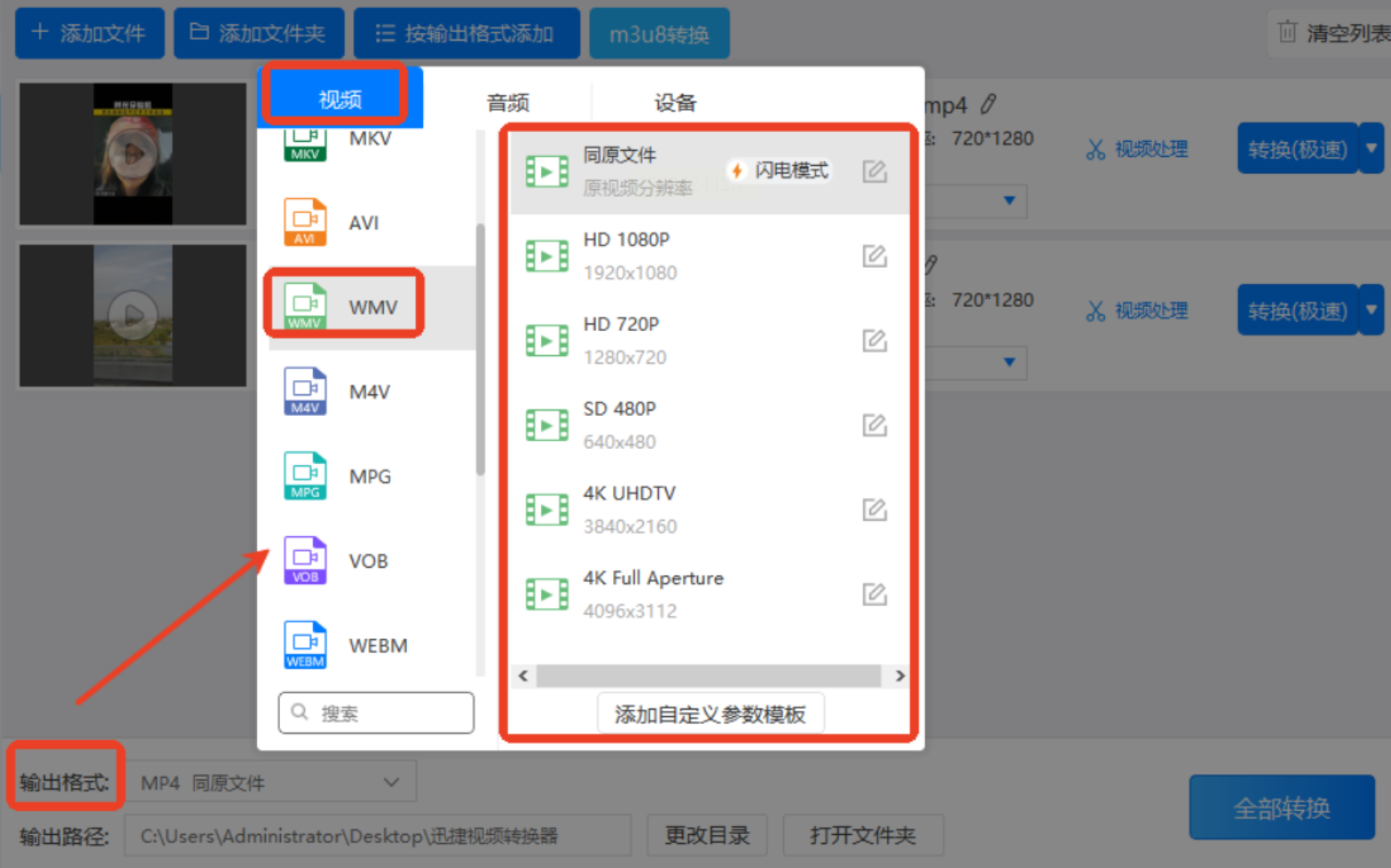 步骤四:在弹出的格式选择窗口中,侧边栏选择“视频”,然后在右侧列表中找到“WMV”格式。点击后,你还可以进一步选择分辨率,从常见的480p到1080p都有预设,甚至允许你自定义更详细的参数。
