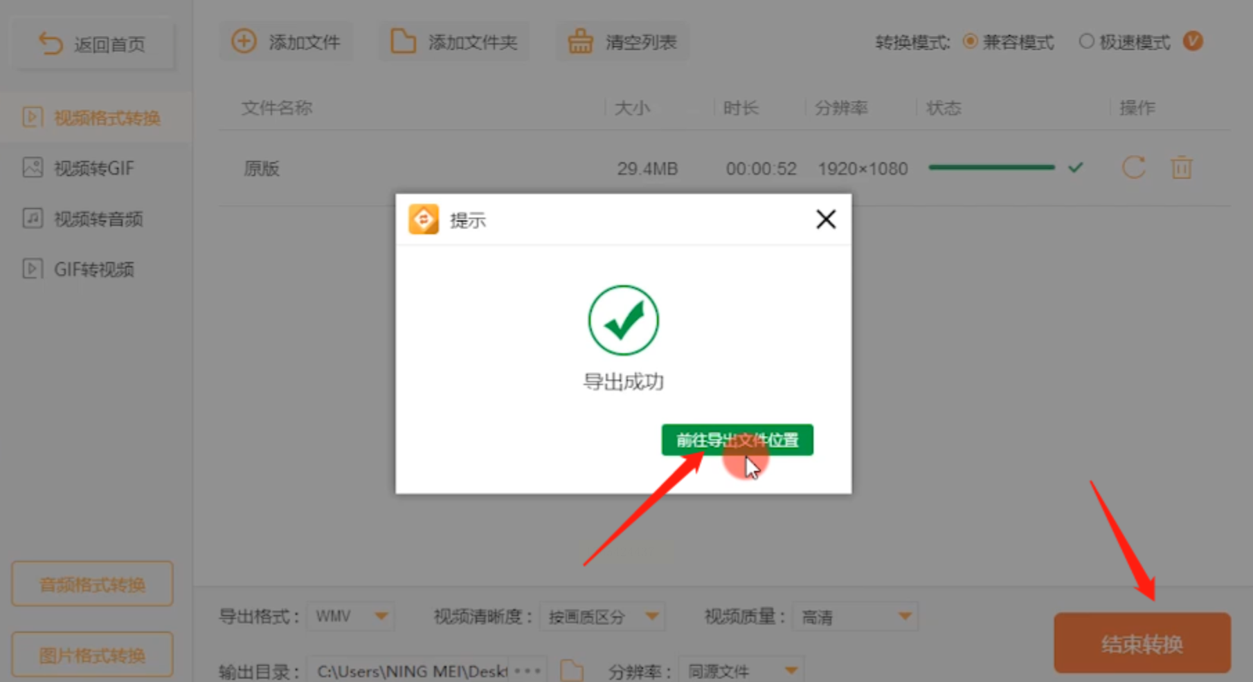 步骤七:转换进度条走完后,你就可以到预设的文件夹中欣赏转换成功的WMV视频了。