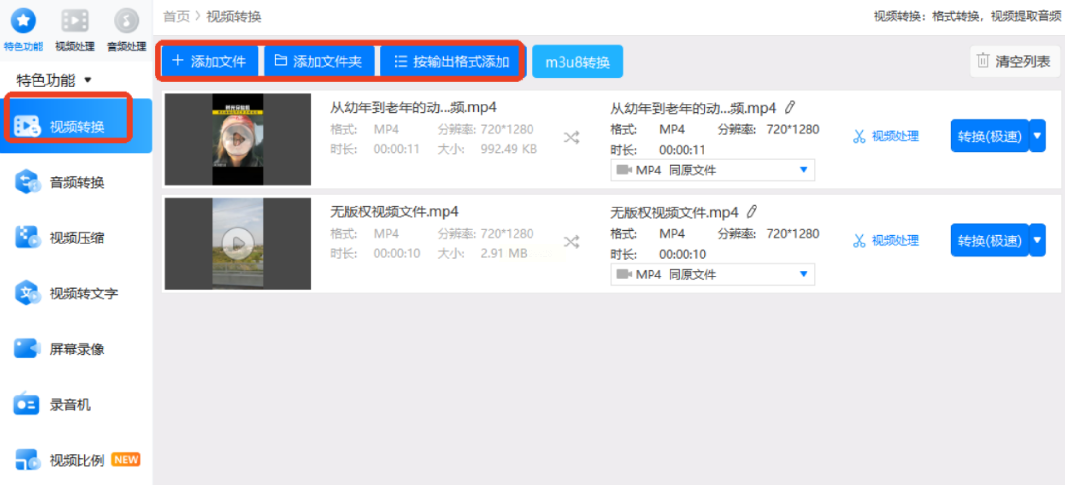 步骤二:通过点击“添加文件”按钮,将你需要转换的MP4视频导入进来。软件支持同时添加多个任务,能显著提升批量处理的效率。