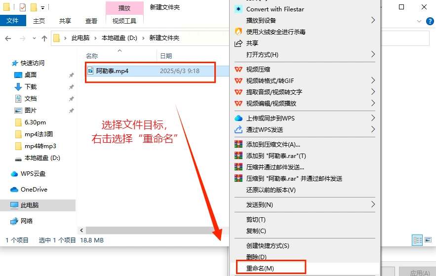 1. 打开文件资源管理器,找到目标视频文件,右键点击选择“重命名”。