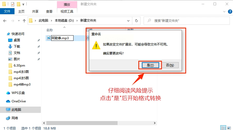 3. 系统弹出“确认修改”提示,点击“是”后,文件会变成“音频格式”图标,但实际播放时可能无法识别,音质也会丢失部分细节。