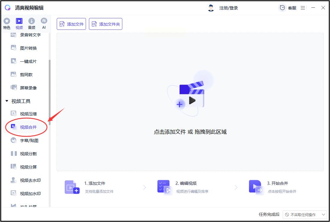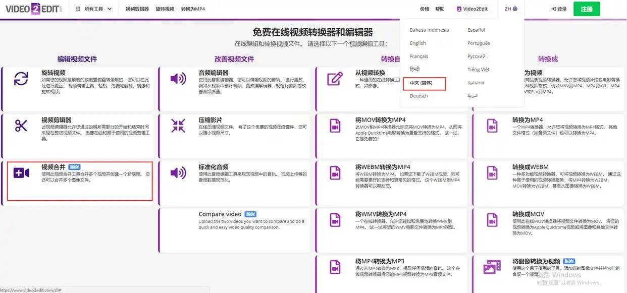 1. 打开网站后先切换中文界面,找到【视频合并】入口