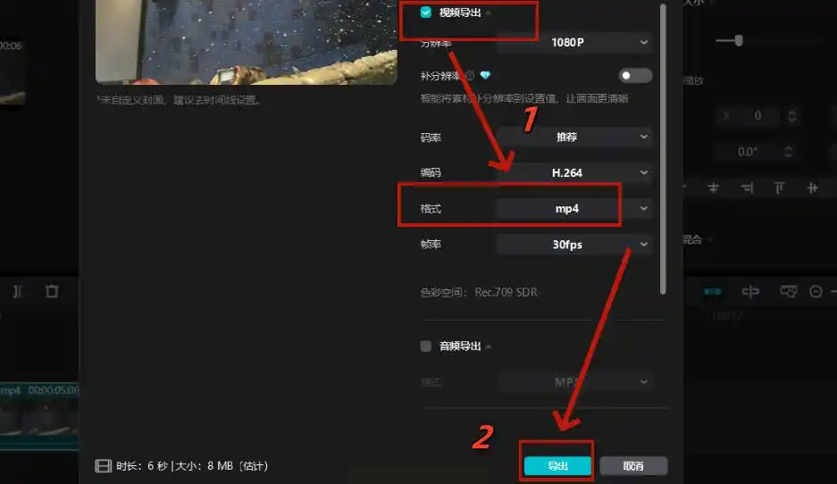 - 步骤二:完成剪辑后点击右上角“导出”按钮,在输出设置中选择“MP4”格式。
