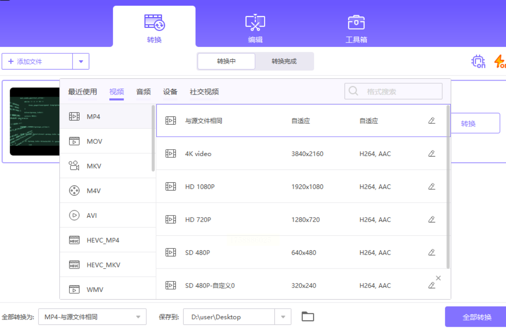 第四步:现在,视频已经就位,我们得告诉软件我们要把它变成什么样子。在软件下方,找到一个叫“输出格式”、“导出格式”或者类似名字的地方。点击它,会弹出一个格式列表,我们在“视频”这一分类里,找到并选择【MP4】。通常软件还会让你选一下分辨率,如果没啥特殊要求,直接选“同源文件”或“保持原质量”就行,这样画质不会有损失。
